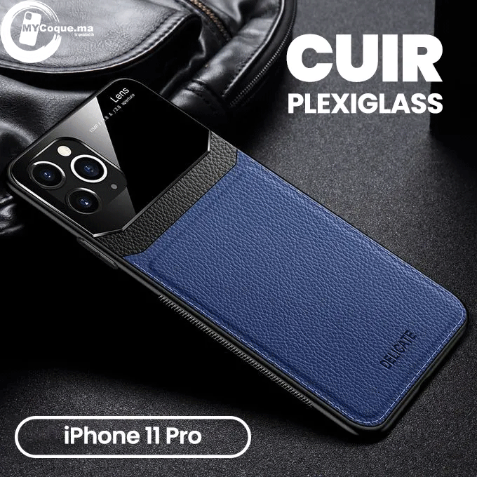 Coque iPhone 11 Pro en Cuir Bleu & Plexiglass Pochette Antichoc