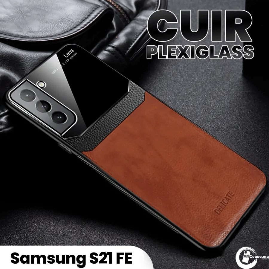 Pochette Samsung S21 FE Etui en Cuir Marron & Plexiglass Coque Antichoc
